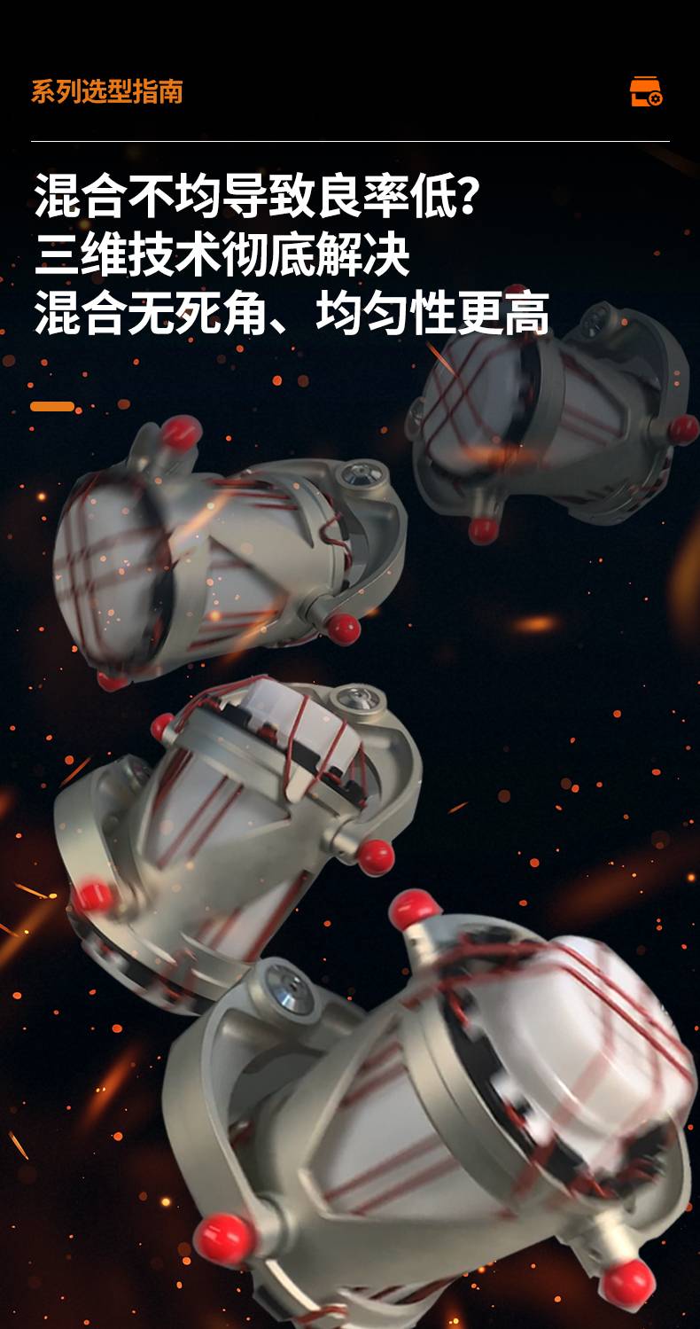1、三维混合机筒体装料率大,可达80~90%(普混合机为40~50%);